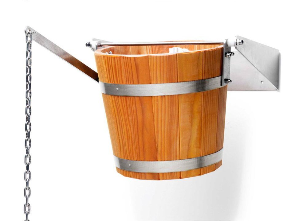 Sprchové vědro o objemu 10 litrů s automatickým napouštěním vody, která příjemně ochladí po saunování. Výška s řetězem: 630 mm