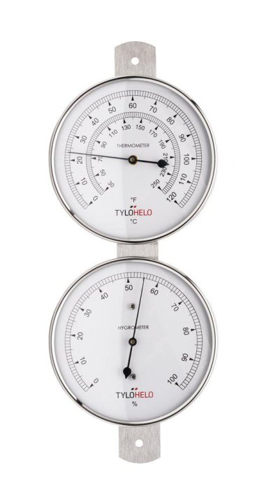 Nerezový vlhkoměr/teploměr s držákem pro montáž na stěnu.
